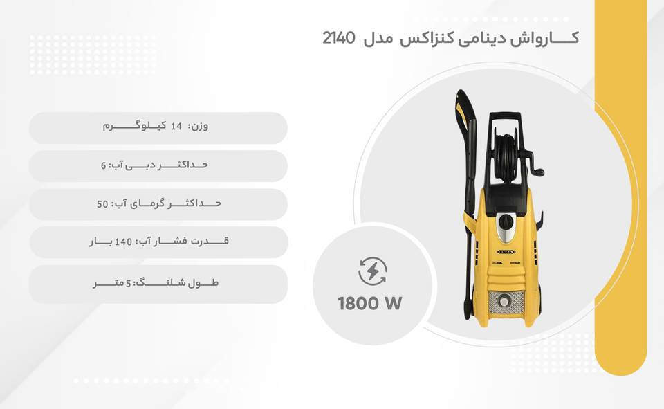 | سایر توضیحات | - دارای مخزن مواد شوینده- دارای چرخ برای حمل آسان- دارای استاندارد IPX5- حداکثر فشار آب ورودی به دستگاه: 0.7 مگا پاسکال- دارای شلنگ جمعکن دستی- دارای کابل برق 5 متری- نوع موتور: القایی |