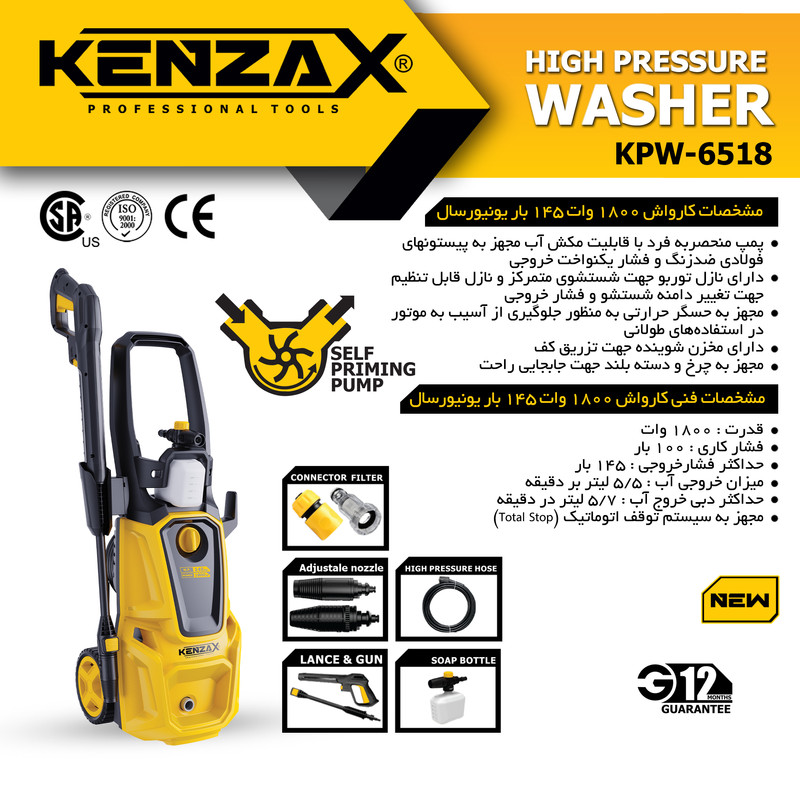 | سایر توضیحات | پمپ منحصربه فرد با قابلیت مکش آب مجهز به پیستونهای فولادی ضدزنگ و فشار یکنواخت خروجی دارای نازل توربو جهت شستشوی متمرکز و نازل قابل تنظیم جهت تغییر دامنه شستشو و فشار خروجی مجهز به حسگر حرارتی به منظور جلوگیری از آسیب به موتور در استفادههای طولانی دارای مخزن شوینده جهت تزریق کف مجهز به چرخ و دسته بلند جهت جابجایی راحتبا استفاده از دستگاه کارواش خانگی، هزینههای بردن خودرو به کارواش را کاهش دهید. ویژگی دستگاه کارواش خانگی این است که علاوه بر بدنه خودرو، از آن میتوان جهت شستوشوی دوچرخه، حیاط و پارکینگ منزل و نمای ساختمان نیز استفاده کرد. در پی استقبال شما عزیزان کارواش (Kenzax) « جدید یونیورسال 1800 وات 145 بار کنزاکس» با طراحی بسیار مناسبی تحت عنوان مدل (KPW-6518) به بازار عرضه شده است. |