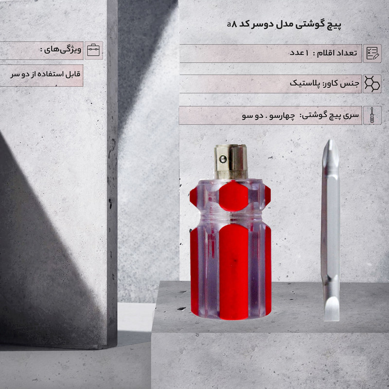 معرفی پیچ گوشتی مدل دوسر کد a8 پیچ گوشتی مدل دوسر کد A8 یک ابزار حرفهای است که برای کارهای گوناگون مورد استفاده قرار میگیرد. این پیچ گوشتی دارای ویژگیهای منحصر به فردی است که آن را مناسب برای استفادههای مختلف میکند. همه چیز درباره پیچ گوشتی مدل دوسر کد a8 ویژگیهای این پیچ گوشتی شامل موارد زیر است: 1. سری دوطرفه: این پیچ گوشتی دارای سری دوطرفهی دو سو و چهارسو است که به شما امکان میدهد از آن برای باز و بسته کردن پیچهای دوسو و چهارسو استفاده کنید. 2. قابلیت تغییر وضعیت سری: برای تغییر وضعیت سری پیچگوشتی از دوسو به چهارسو و بالعکس، میتوانید بخش فلزی را از دسته جدا کرده و وضعیت قرارگیری آن را تغییر دهید. 3. دسته پلاستیکی: دسته این پیچ گوشتی از جنس پلاستیکی ساخته شده است که به شما امکان میدهد با آن به راحتی کار کنید و قدرت و کنترل لازم را در زمان استفاده داشته باشید. 4. مقاومت دسته: دسته پلاستیکی این پیچ گوشتی مقاوم در برابر زنگ زدگی و خش است که به شما امکان میدهد برای مدت طولانی از آن استفاده کنید. 5. جنس سری: سری این پیچگوشتی از جنس فلزی است که قدرت و استحکام لازم را در هنگام استفاده فراهم میکند. با توجه به ویژگیهای فوق، پیچ گوشتی مدل دوسر کد A8 یک انتخاب مناسب برای افراد حرفهای و همچنین برای استفاده در کارهای خانگی است. چرا باید پیچ گوشتی مدل دوسر کد a8 را بخرم؟ پیچ گوشتی مدل دوسر کد A8 به دلیل ویژگیهای منحصر به فردی که دارد، برای کاربردهای مختلفی مناسب است. برخی از کاربردهای این ابزار عبارتند از: 1. تعمیرات خانگی: این پیچ گوشتی برای تعمیرات خانگی و کارهای نگهداری در خانه بسیار مناسب است. شما میتوانید از آن برای باز و بسته کردن پیچها در مبلمان، دربها، پنجرهها و سایر وسایل خانگی استفاده کنید. 2. کارهای الکتریکی: این پیچ گوشتی برای کارهای الکتریکی نیز بسیار مناسب است. شما میتوانید از آن برای باز و بسته کردن پیچها و اتصالات الکتریکی در دستگاههای الکتریکی مانند کامپیوتر، تلویزیون، رادیو و سایر وسایل الکتریکی استفاده کنید. 3. کارهای مکانیکی: این پیچ گوشتی برای کارهای مکانیکی نیز بسیار مناسب است. شما میتوانید از آن برای باز و بسته کردن پیچها و اتصالات در وسایل و دستگاههای مکانیکی مانند خودرو، موتورسیکلت و دوچرخه استفاده کنید. 4. کارهای صنعتی: این پیچ گوشتی برای کاربردهای صنعتی نیز مناسب است. شما میتوانید از آن در کارگاهها و کارخانهها برای تعمیرات و نگهداری دستگاهها و تجهیزات صنعتی استفاده کنید. با توجه به کاربردهای گوناگونی که این ابزار دارد، پیچ گوشتی مدل دوسر کد A8 یک ابزار کارآمد و چندمنظوره است که در بسیاری از زمینهها میتواند مورد استفاده قرار گیرد. انواع پی گوشتی ها پیچ گوشتی یک ابزار دستی است که برای باز و بسته کردن پیچها استفاده میشود. این ابزار از یک مهره یا سر مخصوص برای گرفتن پیچها و یک دسته برای اعمال گشتاور و گشتاور معکوس بر روی پیچها تشکیل شده است. پیچ گوشتیها به انواع مختلفی تقسیم میشوند که این شامل موارد زیر میشود: 1. پیچ گوشتی معمولی: این نوع پیچ گوشتی دارای یک سر مهره و یک دسته است و برای باز و بسته کردن پیچهای معمولی استفاده میشود. 2. پیچ گوشتی تورک: این نوع پیچ گوشتی دارای یک سر مهره با فرم خاص تورک و یک دسته است و برای استفاده در مواردی که نیاز به کنترل دقیق گشتاور در باز و بسته کردن پیچها وجود دارد، استفاده میشود. 3. پیچ گوشتی الکتریکی: این نوع پیچ گوشتی دارای یک موتور الکتریکی است که برای اعمال گشتاور به پیچها استفاده میشود و به صورت خودکار پیچها را باز و بسته میکند. 4. پیچ گوشتی هوشمند: این نوع پیچ گوشتی دارای امکانات هوشمندی مانند قابلیت اتصال به دستگاههای هوشمند و کنترل از راه دور است و برای کاربردهای پیچهای پیچیده و پیچهایی که نیاز به دقت بالا دارند، استفاده میشود. این تنها چند نمونه از انواع پیچ گوشتی هستند و با توجه به نیاز و کاربردهای مختلف، انواع دیگری نیز وجود دارند. خرید آنلاین پیچ گوشت
